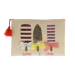 Colorata busta in tessuto misto cotone e poliestere con decorazione in paillettes cucite e piccole applicazioni di fiocchetti in passamaneria. Chiusura con cerniera e piccola nappina decorativa.