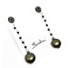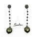 Orecchino a perno dorato con bottone di strass grigi e pendente composto da una catenella con cristalli e perla schiacciata metallizzata violacea.